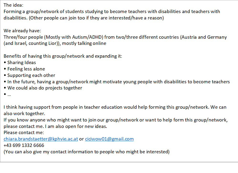 I have promised Chiara, a student with special needs, who took part in the SEN TIG, to help her having this add posted on the journal and FB-group, with an advice to share it to everybody who may (know someone who may) be interested in joining a network for students to become teachers or teachers (and the like) with disabilities, to join a group / network!