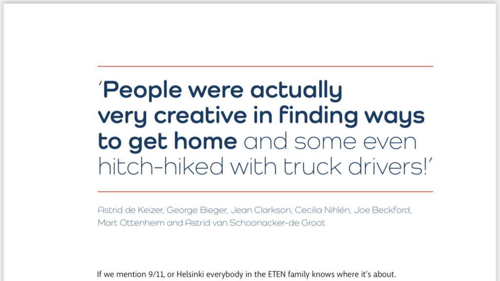 If we mention 9/11, or Helsinki everybody in the ETEN family knows where it’s about. Memories, emotions and all the stories connected to these historical moments will pop up. Within a few years, or probably even more early the word Corona will be added to this ‘calamity list’.