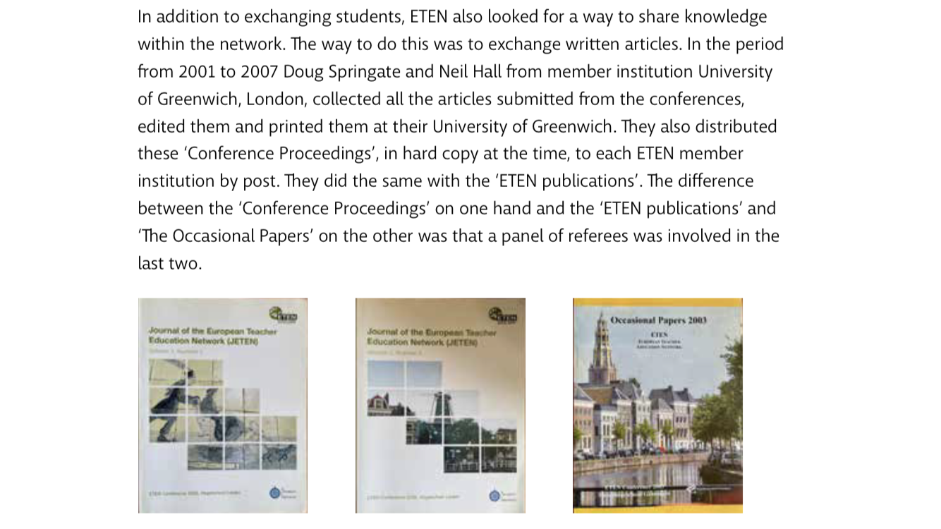 In addition to exchanging students, ETEN also looked for a way to share knowledge within the network. The way to do this was to exchange written articles. In the period from 2001 to 2007 Doug Springate and Neil Hall from member institution University of Greenwich, London, collected all the articles submitted from the conferences, edited them and printed them at their University of Greenwich. They also distributed these ‘Conference Proceedings’, in hard copy at the time, to each ETEN member institution by post. They did the same with the ‘ETEN publications’. The difference between the ‘Conference Proceedings’ on one hand and the ‘ETEN publications’ and ‘The Occasional Papers’ on the other was that a panel of referees was involved in the last two.