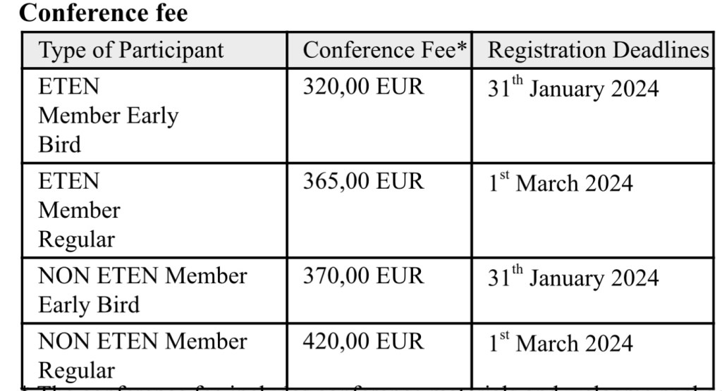 * The conference fee includes conference materials and welcome package, coffee breaks (Wednesday –Friday), conference reception on Wednesday, lunch (Wednesday ECOs and TIG Leaders, Thursday and Fridayfor all participants), the cultural activities and the conference dinner on Friday.