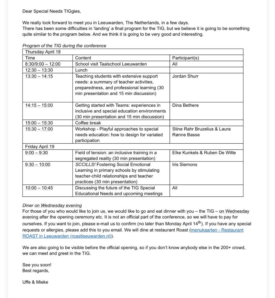 The TIG Special Educational Needs (SEN) brings together educators, researchers, and practitioners committed to fostering inclusive education across Europe and beyond. Our mission is to create a collaborative space where knowledge, experiences, and good / best practices are shared to support learners with diverse needs from an inclusive perspective. The aim of the TIG is to discuss and compare good practices related to Special Educational Needs (SEN), Inclusion, and Diversity across different countries. And to promote SEN teaching within educational programs that are mostly based on published research outcomes.